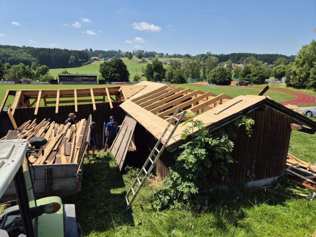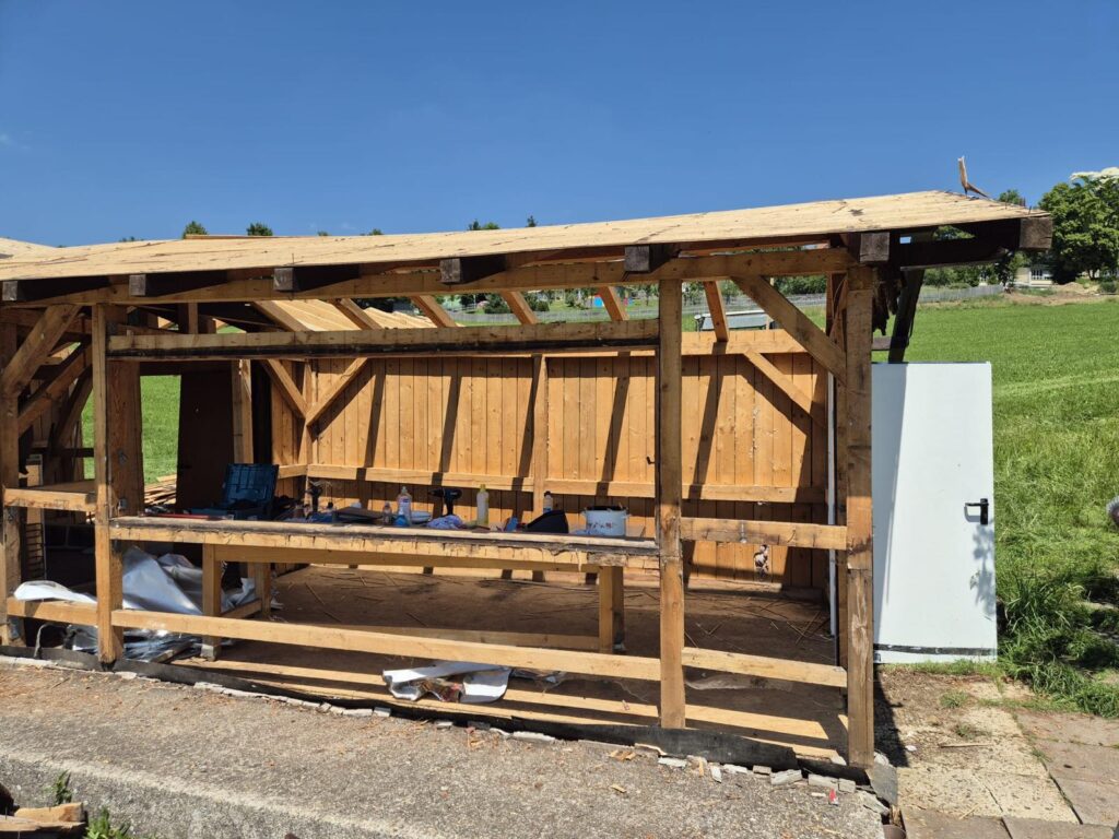 Im Juni sind wir dann in den Rückbau des Bestandsgebäudes gestartet. In 3 Tagen war der gute alte Kiosk bis zum Fundament abgerissen. So wurde auch nochmal ersichtlich, welchen Versatz die zwei Bodenplatten zueinander haben und was letztlich den Neubau begründet. Was weiter brauchbar ist wurde eingelagert.